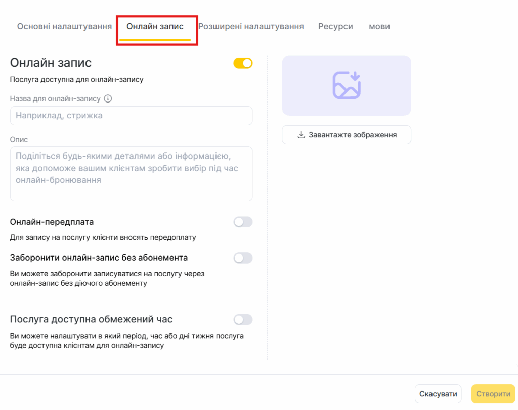 Для швидкого увімкнення та вимкнення онлайн-запису натисніть на перемикач під шапкою «Онлайн-запис» поруч із назвою послуги.