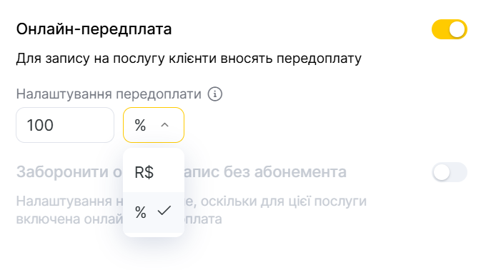 Для онлайн-передплати необхідно перемкнути відповідний повзунок у полі «Онлайн-передплата». Якщо онлайн-передплата увімкнена, клієнти зможуть оплатити послугу у віджеті онлайн-запису.