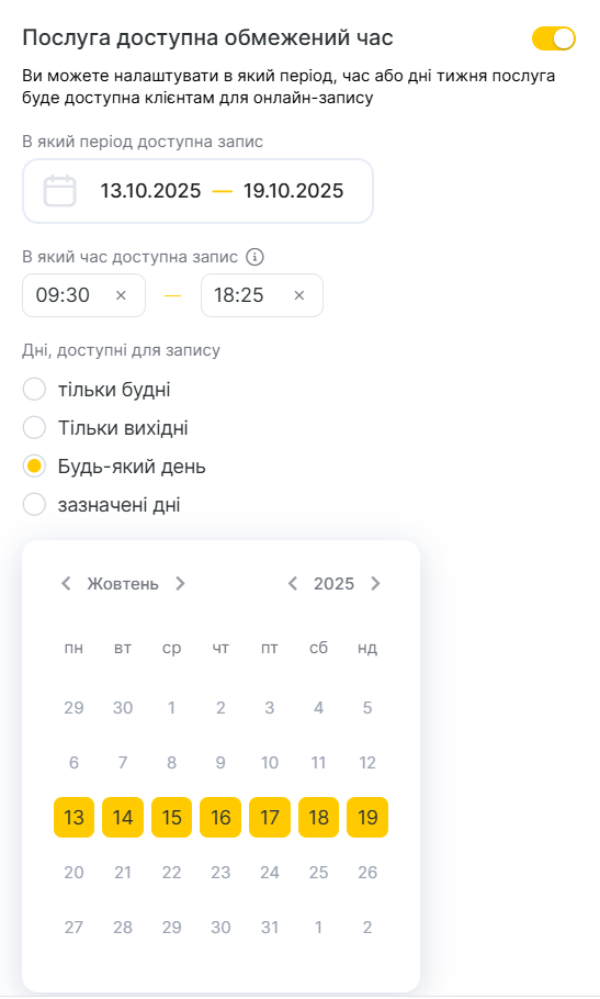 За потреби перемкніть повзунок «Послуга доступна обмежений час». Вкажіть «У який період доступний запис», «У який час доступний запис», та «Дні, доступні для запису» («Тільки будні», «Тільки вихідні», «Будь-який день», «Вказані дні» — для вказаних днів потрібно відзначити необхідні дні у календарі).