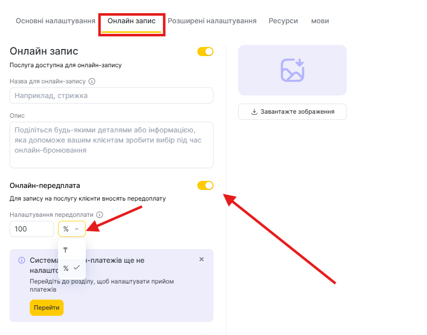 - Для онлайн-передплати необхідно перемкнути відповідний повзунок у полі Онлайн-передплата. Якщо онлайн-передплата увімкнена, клієнти зможуть оплатити послугу у віджеті онлайн-запису.