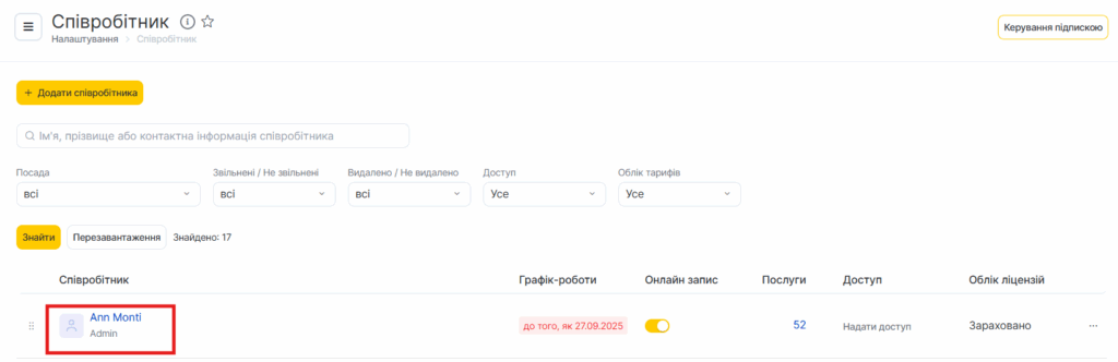 Після заповнення розділу «Послуги» додайте та відредагуйте інформацію про співробітників вашої компанії.