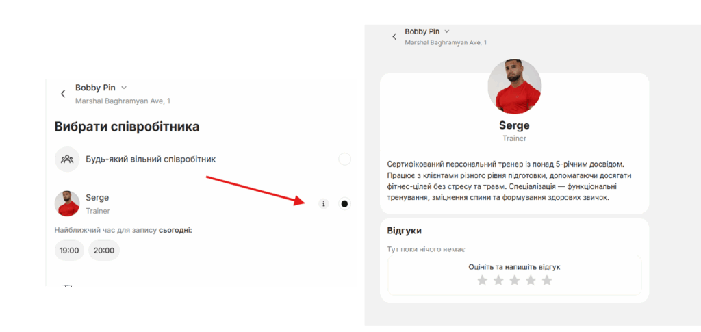 Опис відображається у віджеті онлайн-запису після натискання на іконку “i” поруч із фото співробітника.