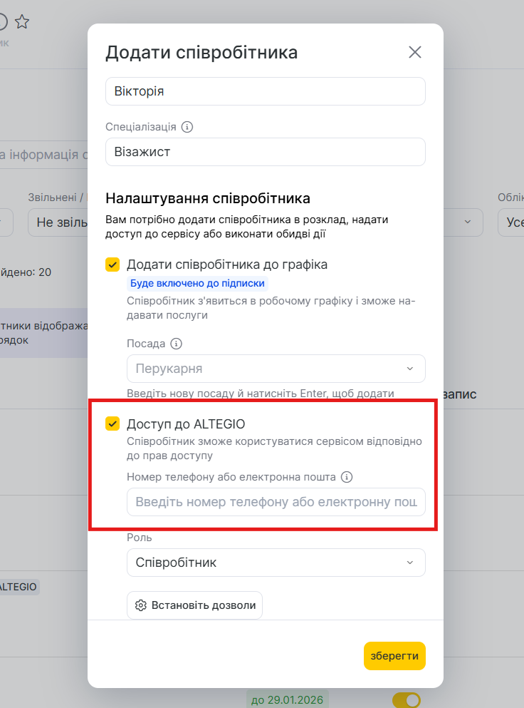 - Доступ до Altegio — надайте співробітнику доступ до системи, щоб він міг користуватися сервісом відповідно до призначених прав доступу, наприклад переглядати свій розклад, звіти тощо. Для цього вкажіть номер телефону або електронну пошту, оберіть роль співробітника (Спеціаліст, Адміністратор, Кол-центр, Бухгалтер, Менеджер, Власник) та налаштуйте права доступу. Кожна роль має власний набір прав, однак за потреби ви можете його відредагувати. Детальніше про ролі співробітників і права доступу читайте у відповідній статті.