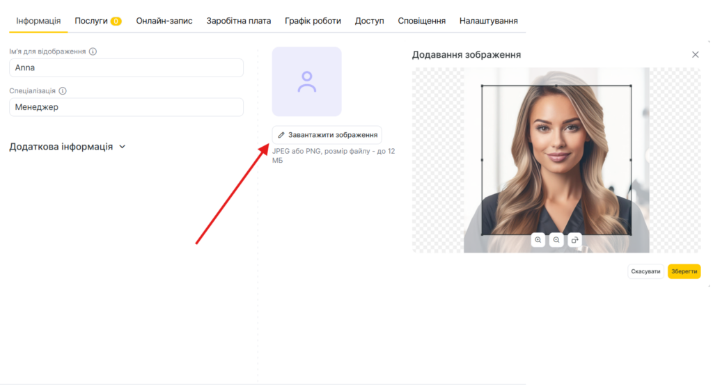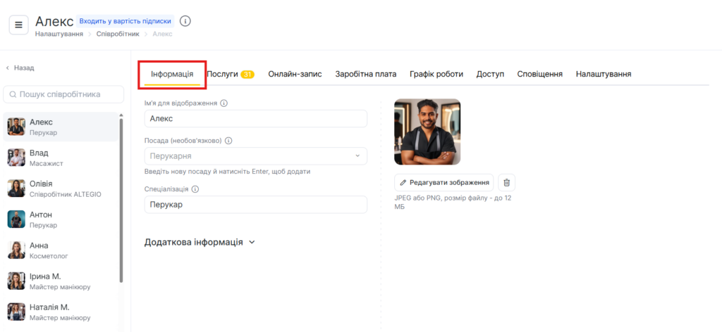 - На вкладці Інформація ви можете відредагувати основні дані співробітника, зокрема ім’я, посаду, спеціалізацію, контактну інформацію та фото профілю.