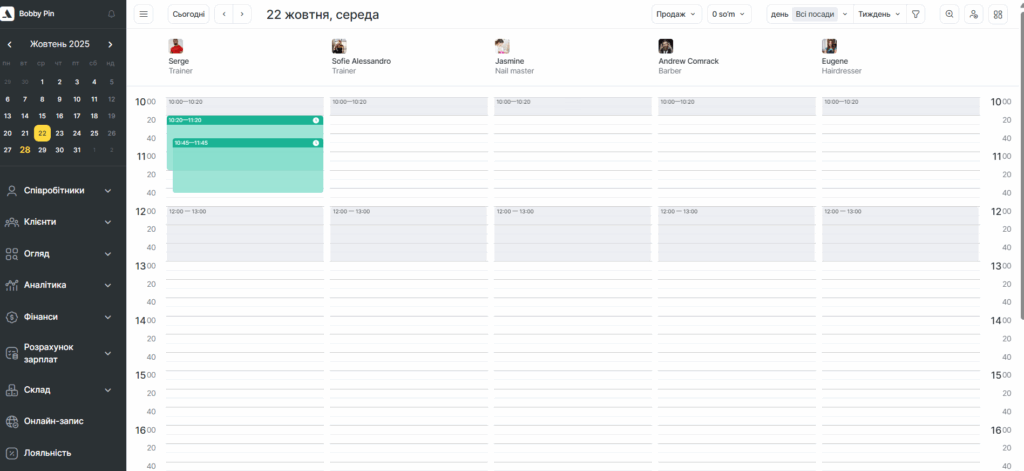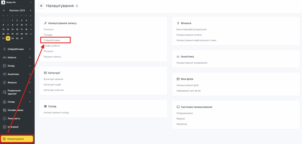 У розділі «Налаштування» > «Налаштування запису» > «Співробітники» вказується та налаштовується вся інформація про співробітників, послуги, які вони надають, графік їхньої роботи, а також схеми розрахунку заробітної плати.