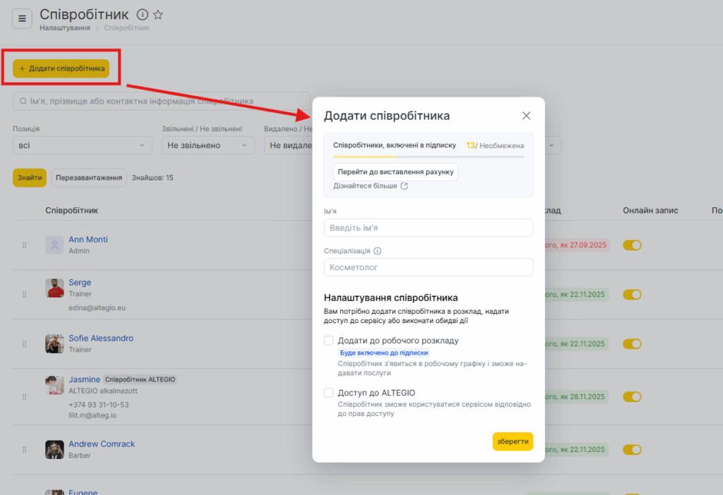 2. Щоб додати нового співробітника, натисніть кнопку «Додати співробітника». У спливаючому вікні вкажіть ім’я співробітника, його посаду (докладніше про призначення та налаштування розділу «Посади» читайте [тут]) і спеціалізацію (наприклад, стиліст-візажист).