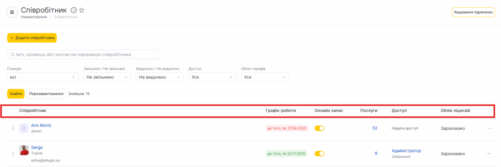 Надає послуг. У стовпці показано загальну кількість послуг, прив’язаних до співробітника. Щоб перейти до налаштування послуг співробітника, натисніть на число в стовпці або на напис «Не надає», якщо послуги не прив’язані. Докладніше про це читайте у статті “Налаштування послуг співробітника”.