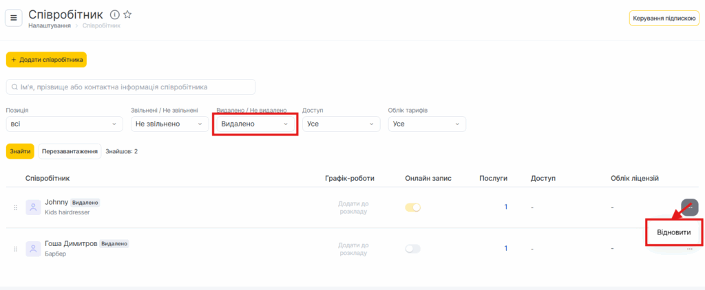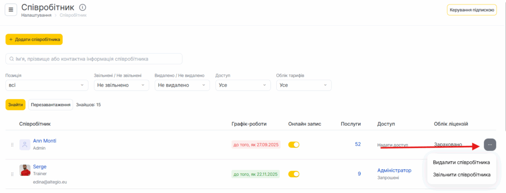Для зручності ви можете переглядати співробітників вибірково — відфільтрувавши список за «Посадою» або за статусами «Видалені / Невидалені», «Звільнені / Незвільнені».