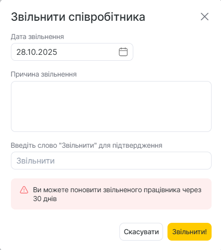Виберіть дію звільнити, якщо потрібно прибрати співробітника зі списку, але при цьому зберегти всю статистику по ньому. Введіть дату та причину звільнення, введіть слово “Звільнити” для підтвердження, і натисніть кнопку “Звільнити”.