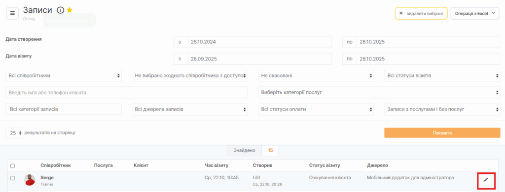 Якщо існують майбутні записи, відкрийте їх за допомогою кнопки “Редагувати” (іконка олівця) і перейдіть до їх перенесення або видалення, домовляючись з клієнтом в залежності від ситуації.