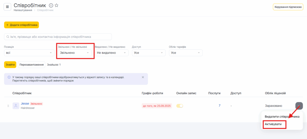 Розклад звільнених співробітників відображається у журналі запису. Звільнений співробітник не відображався у журналі, необхідно очистити його видання. Зручніше це зробити в розділі Налаштування > Налаштування запису > Співробітники.