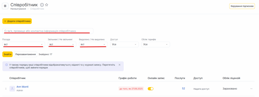 Співробітників можна переміщувати по списку, для цього натисніть на кнопку з трьома смужками зліва від співробітника і перетягніть рядок на потрібне місце. Ця послідовність відображається у журналі і віджеті онлайн-запису.