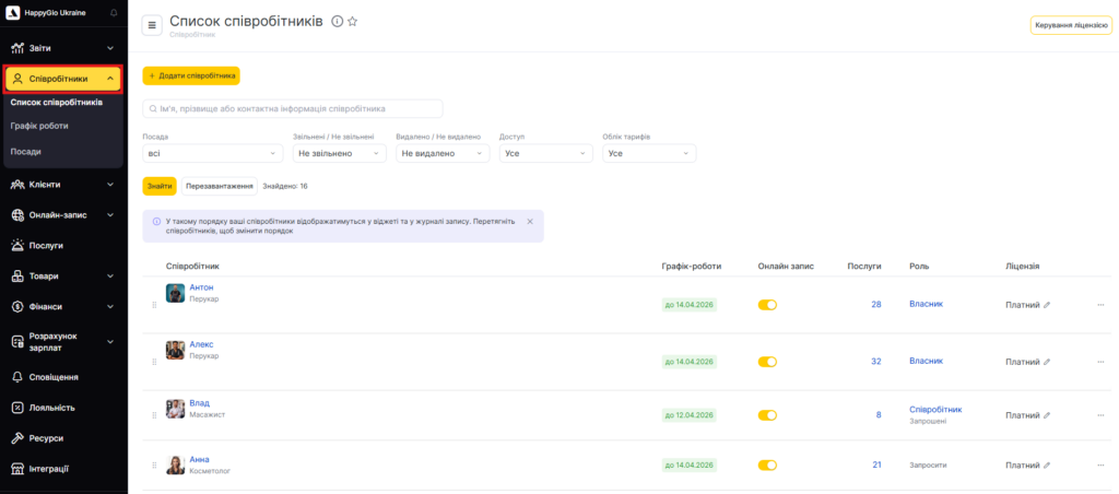 Співробітників можна змінювати місцями у списку, перетягуючи рядки за іконку сортування зліва. Цей порядок відображається у журналі записів та у віджеті онлайн-запису.