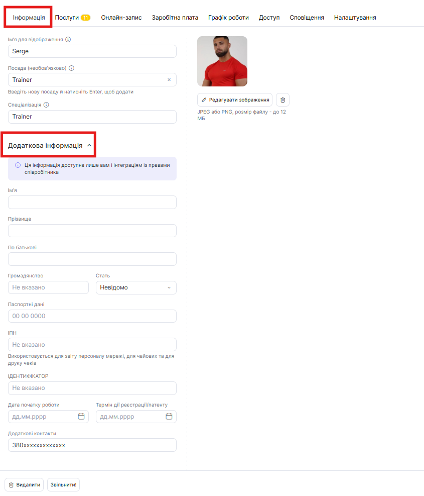 - Виберіть співробітника, натисніть на його ім’я, розгорніть блок Додаткова інформація. Заповніть необхідні поля.