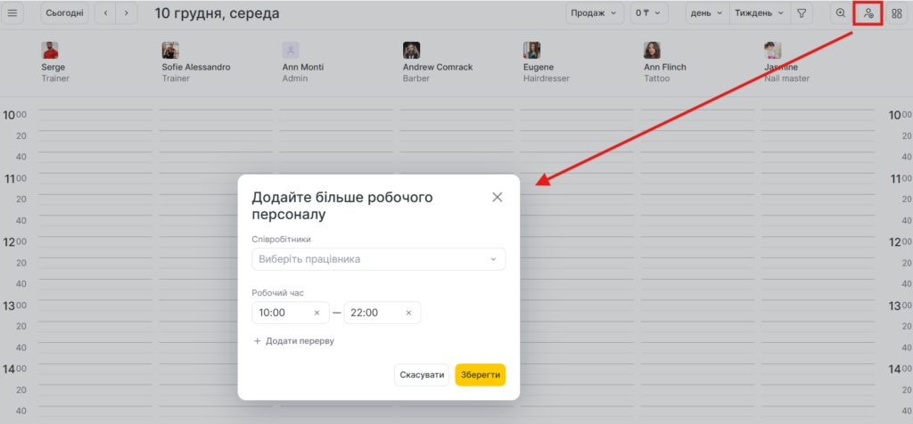 - Виберіть одного або кількох співробітників зі списку, вкажіть час роботи.