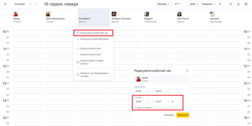 Якщо на вибрану дату співробітника є записи, і ви не перенесете або не скасуйте їх, знову додайте робочий день, і записи з’являться в розкладі співробітника. Перенесіть або скасуйте їх, а потім знову скасуйте робочий день.