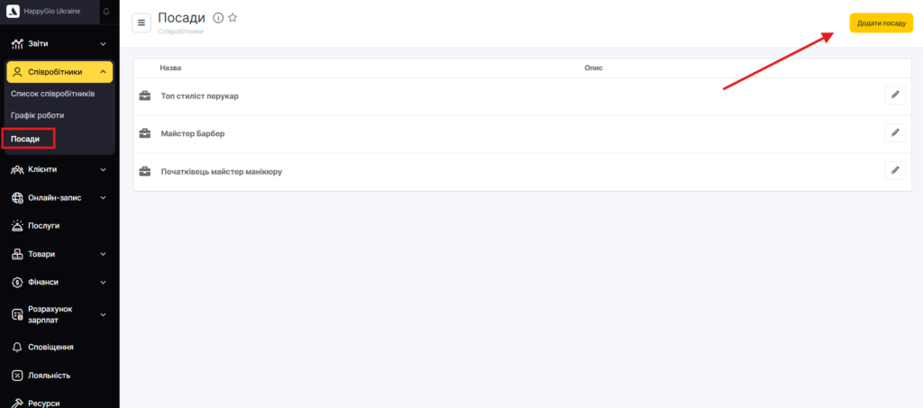 - Перейдіть в основному меню в розділ Співробітники > Посади та натисніть кнопку Додати посаду.