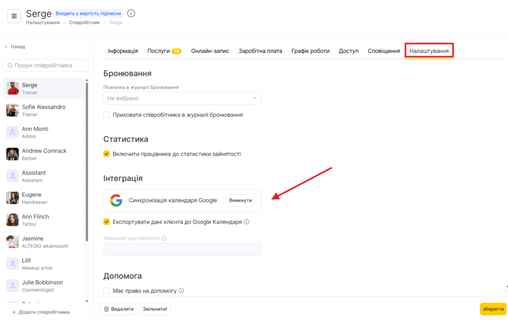 Google Календар підключається для конкретного співробітника або для кількох співробітників. Синхронізація здійснюється з Altegio у Google Календар, але не навпаки.