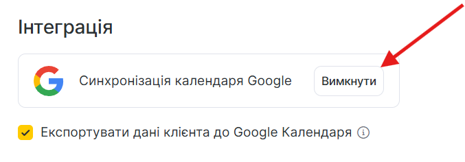 - Якщо увімкнути опцію Експортувати дані клієнта до Google Календаря, під час запису в Google Календар будуть потрапляти дані клієнта. Якщо цю функцію вимкнено, то в календар потрапить лише ім’я.