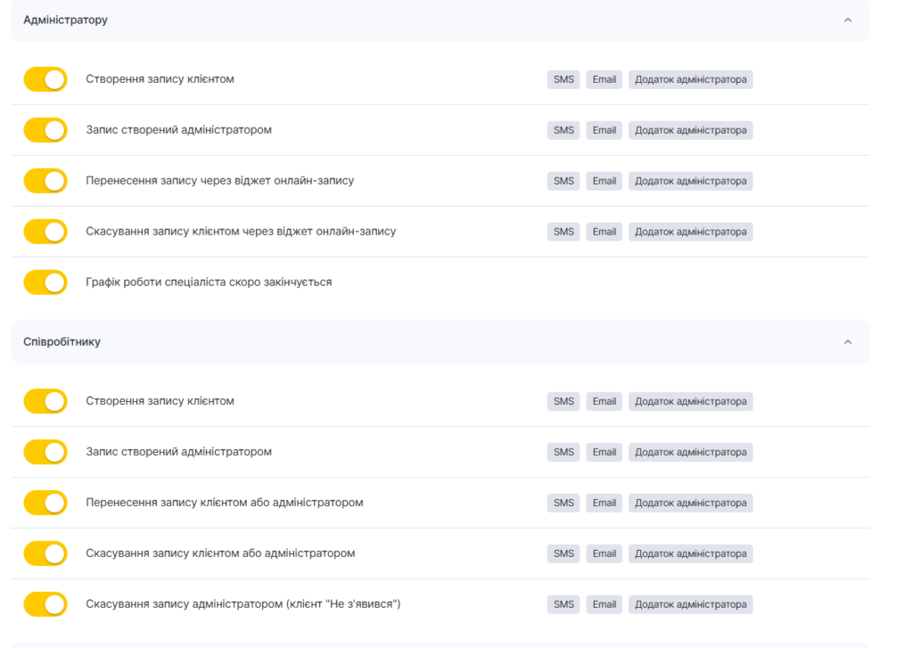 - Вибір сповіщень і каналів. Відмітьте потрібні сповіщення, які отримуватиме співробітник або адміністратор, а також канали їх надсилання — SMS, Push або Email.