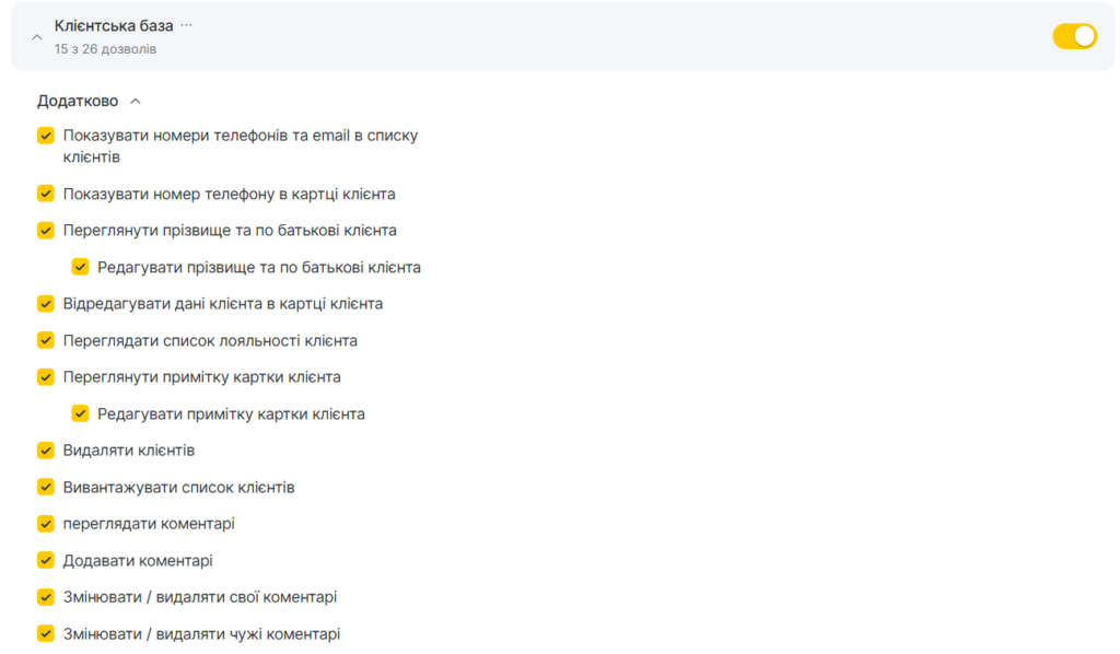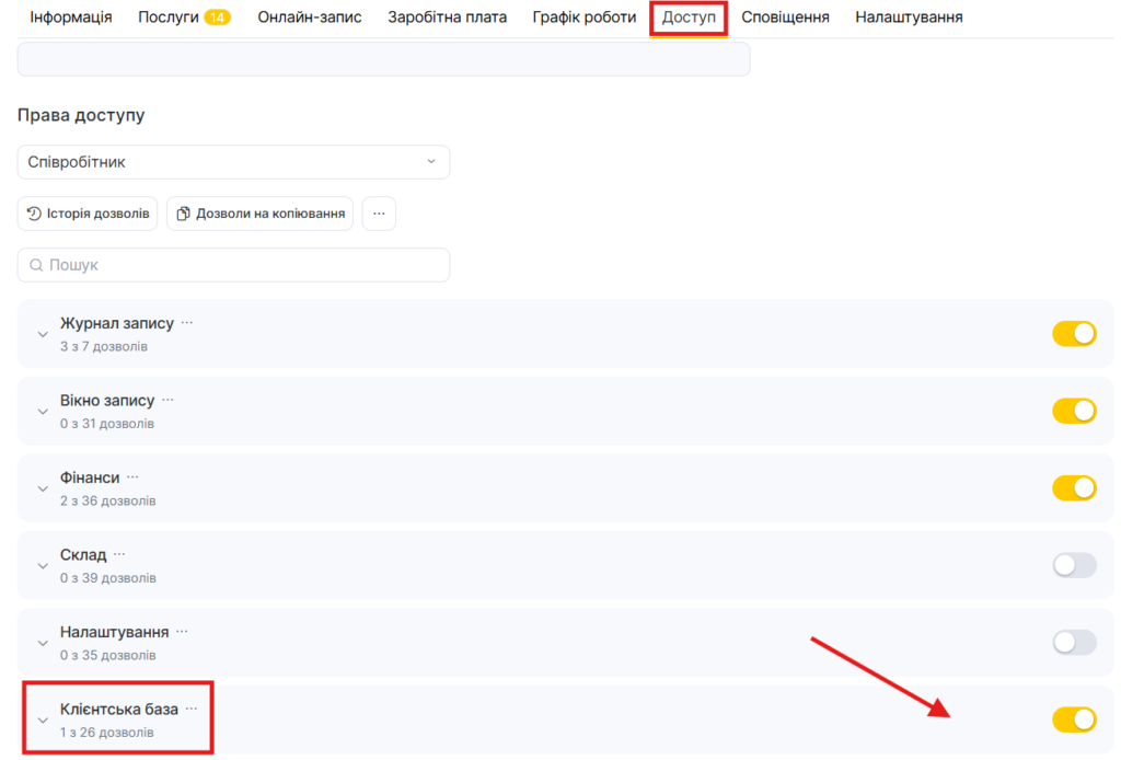 - Знайдіть необхідний блок прав і активуйте його за допомогою повзунка, після чого натисніть на назву блоку Клієнтська база та увімкніть конкретні права, які хочете надати співробітнику.