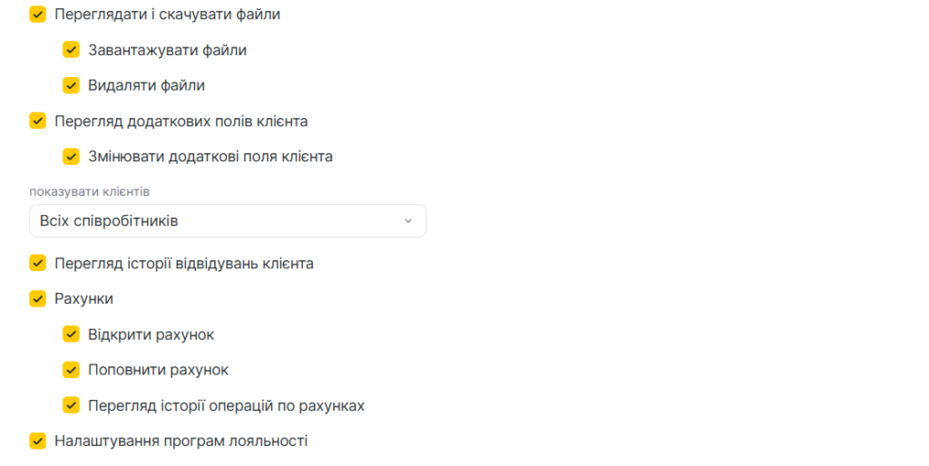 Налаштування доступу передбачає призначення/зняття прав для перегляду даних та видалення клієнтів, створення, перегляд та зміну коментарів.
