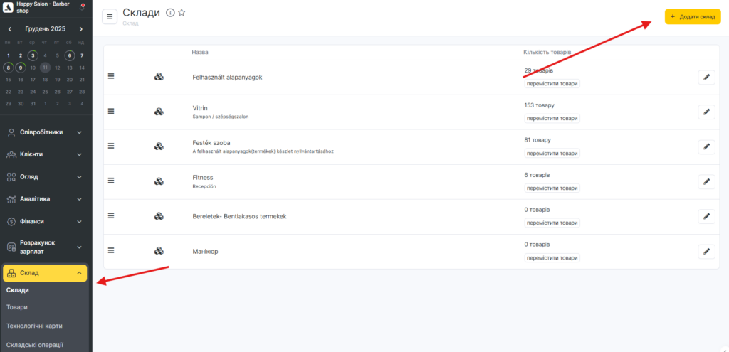 За замовчуванням в Altegio створено два склади: Матеріали та Товари. Склади можна додавати, налаштовувати та видаляти.