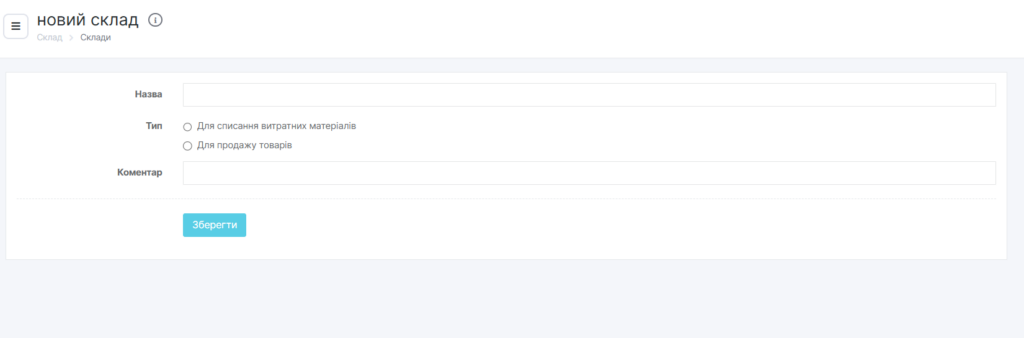 - У новому вікні вкажіть Назву, Тип складу (для списання витратних матеріалів або для продажу товарів) та Коментар.