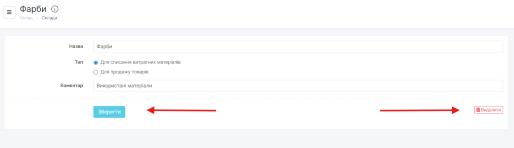 - Натисніть кнопку Зберегти. Також тут можна видалити склад.