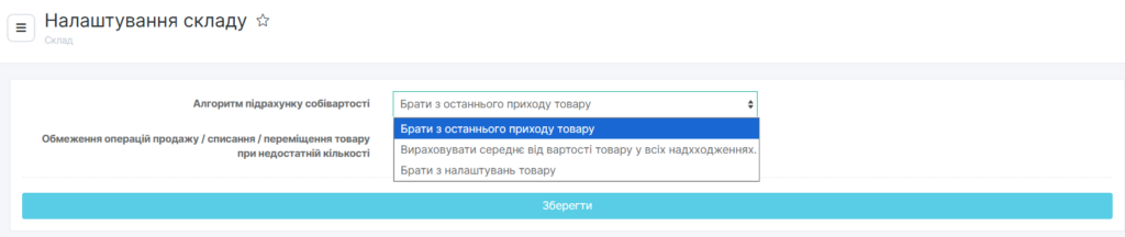 Алгоритм підрахунку собівартості налаштовується у налаштуваннях складу. Значення собівартості товару можна брати з налаштувань товару чи з останнього приходу товару, і навіть можна вираховувати середнє від вартості товару у всіх приходах.