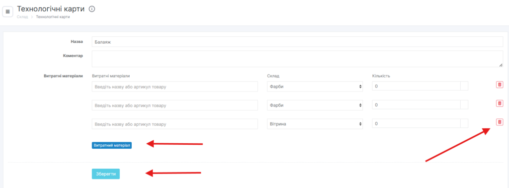 - Додайте Витратний матеріал: дані про матеріали, які будуть списуватися: