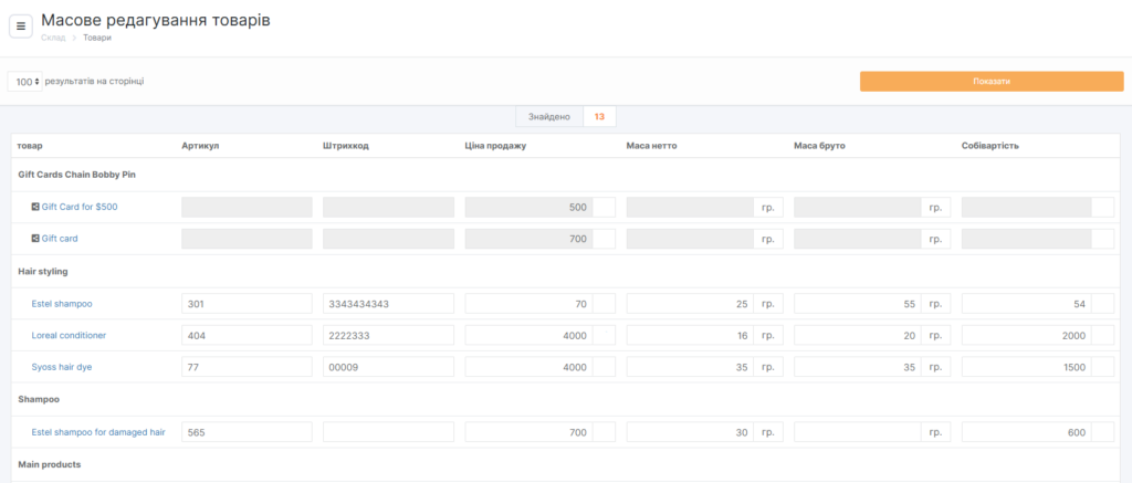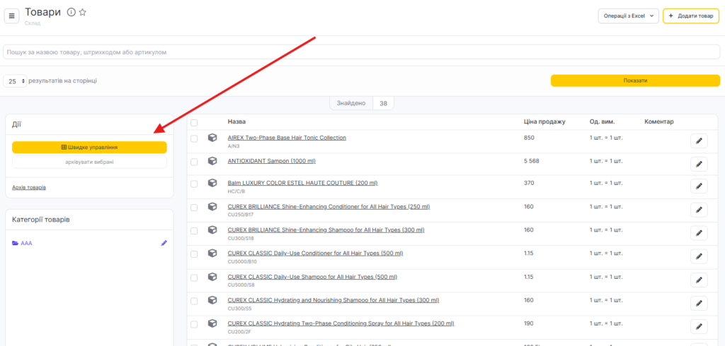 Для редагування інформації про товари в масовому порядку перейдіть до розділу Склад > Товари та натисніть кнопку Швидке управління.