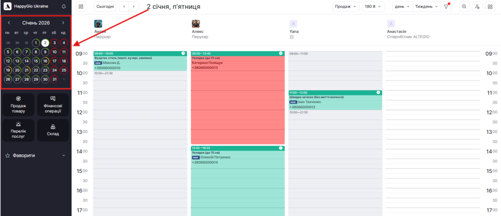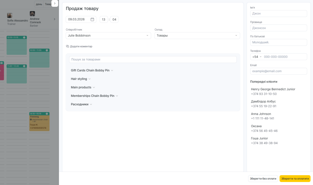 Там же, натиснувши Продаж, ви можете продати товар клієнту, навіть якщо у нього немає запису на вибраний день.