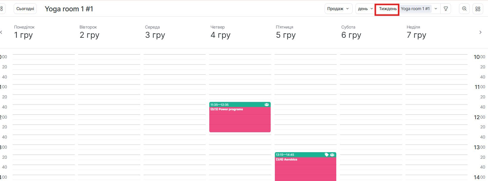 У режимі Тиждень можна переглядати розклад на весь тиждень тільки по одному співробітнику або ресурсу.