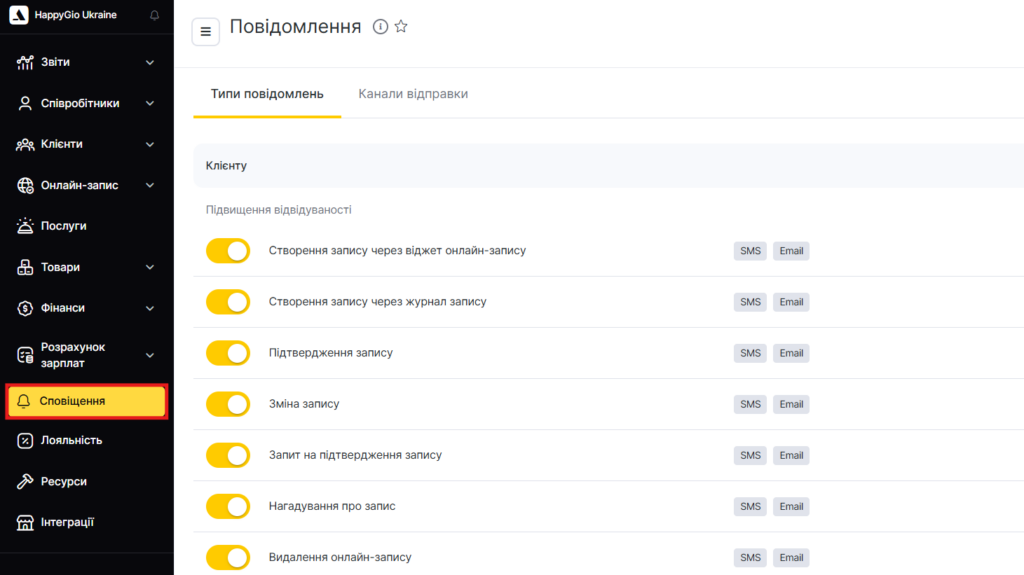 За замовчуванням використовуються налаштування з розділу Сповіщення (режим Адміністрація)