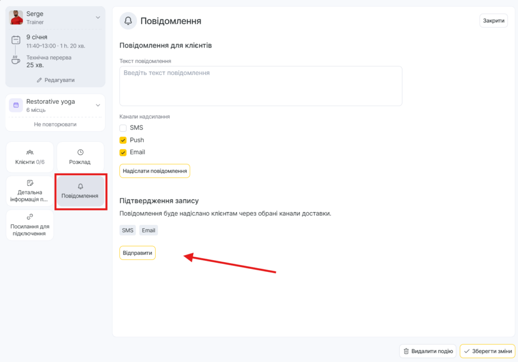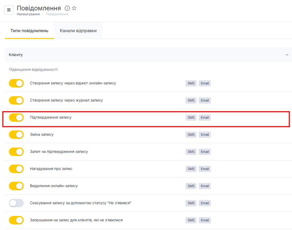Виберіть тип Повідомлення клієнта про Підтвердження запису