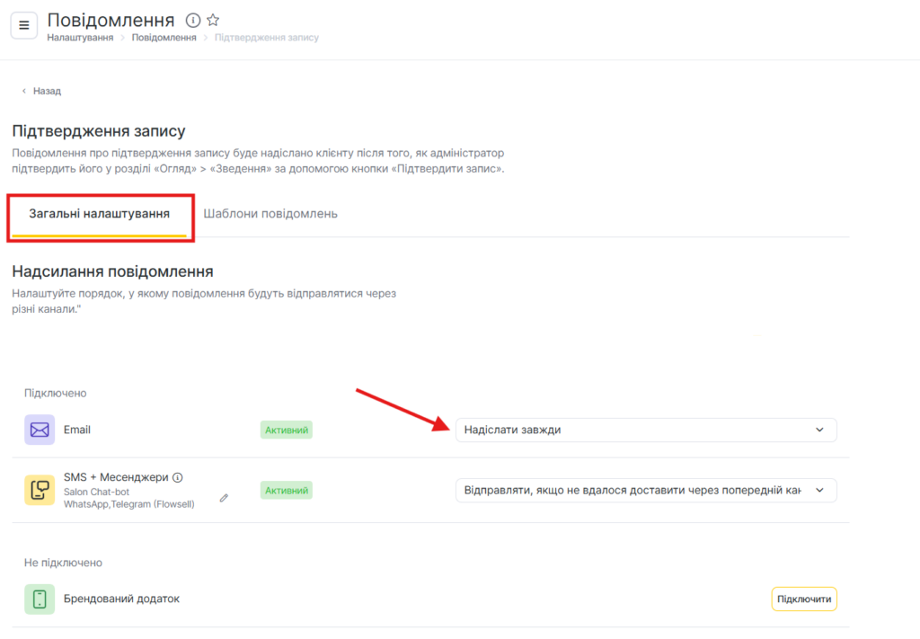 - У вікні Загальні налаштування увімкніть надсилання повідомлень через Email.