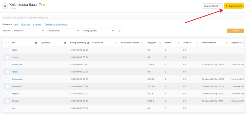 У розділі Клієнти > Клієнтська база відображається інформація про всіх клієнтів, які відвідували вашу компанію.