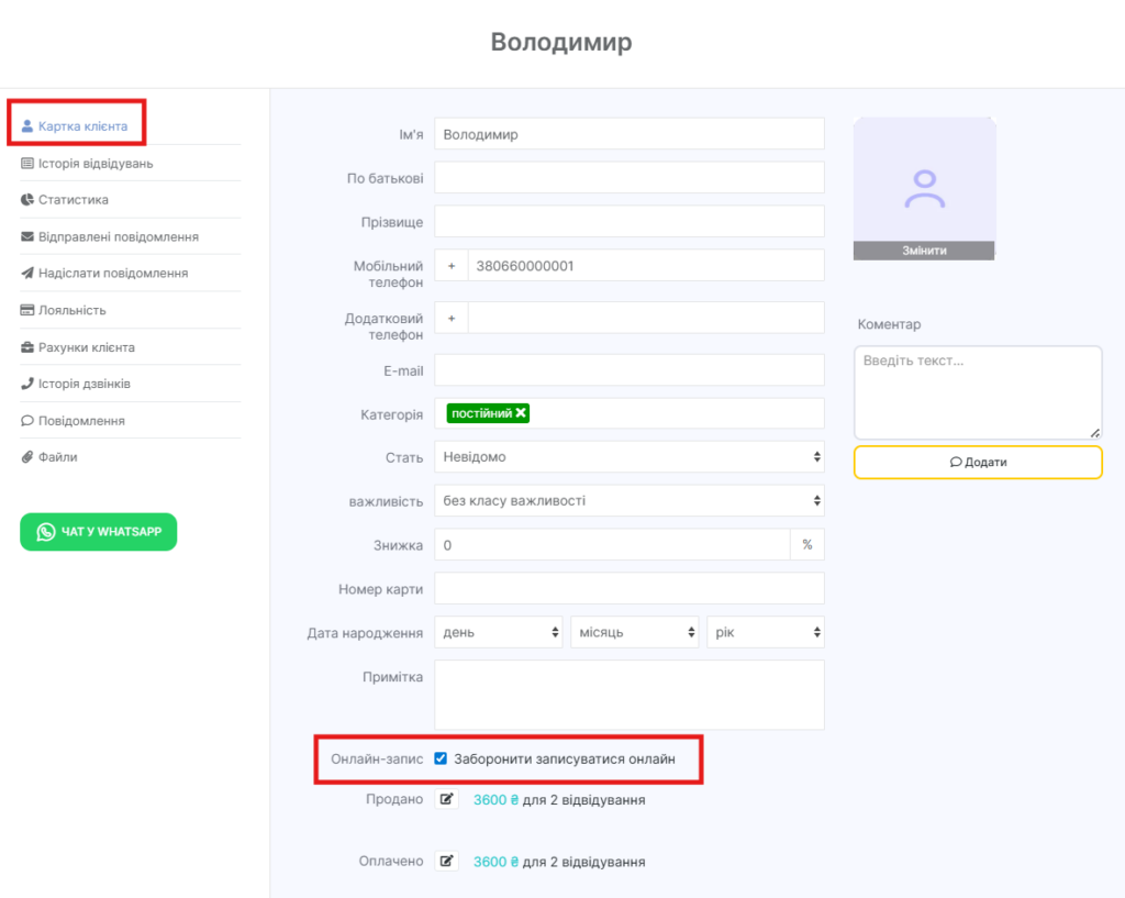 Якщо адміністратор записує клієнта вручну, можна призначити клієнту певну категорію, щоб співробітники бачили, що клієнт перебуває в чорному списку. Для цього використовується картка клієнта. Докладніше про налаштування читайте в статті.