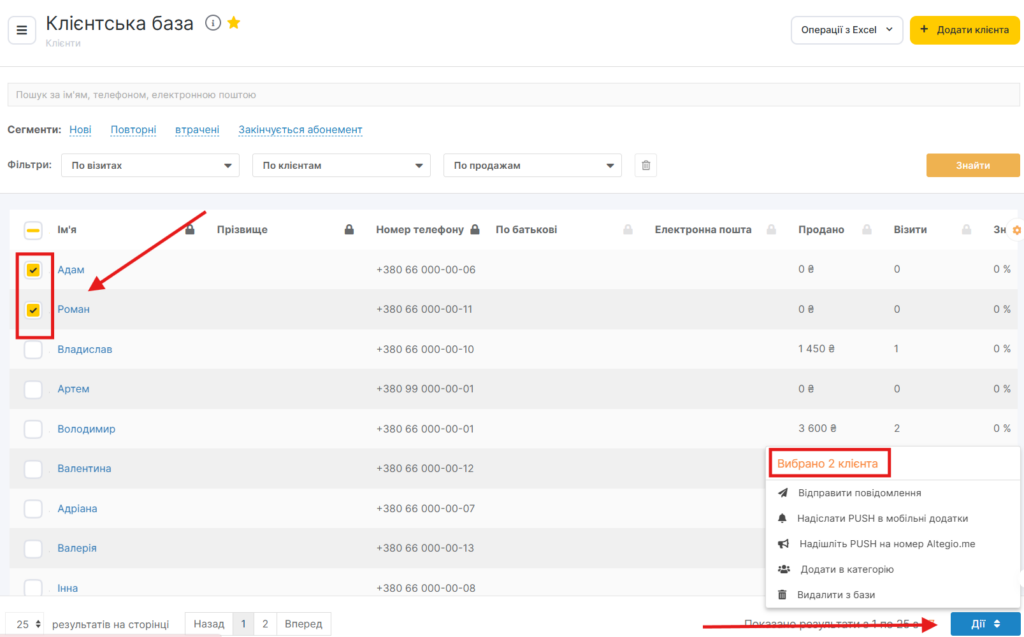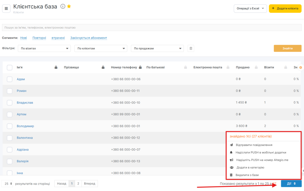 Ви можете здійснювати масові розсилки клієнтам, надсилати повідомлення, видаляти клієнтів з бази, надавати їм категорії, вивантажувати інформацію в Excel. Щоб виконати дію для всіх клієнтів, натисніть кнопку «Дії» та виберіть потрібний пункт зі списку.