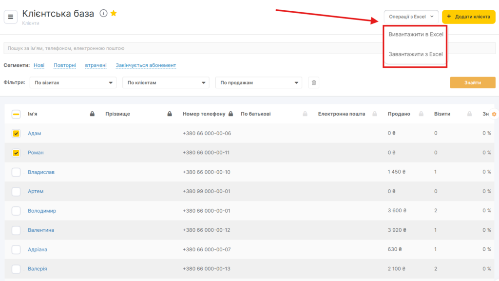 Інформацію про клієнтів можна вивантажувати в Excel. Для цього у верхньому правому куті екрана натисніть «Операції з Excel» > «Вивантажити в Excel».