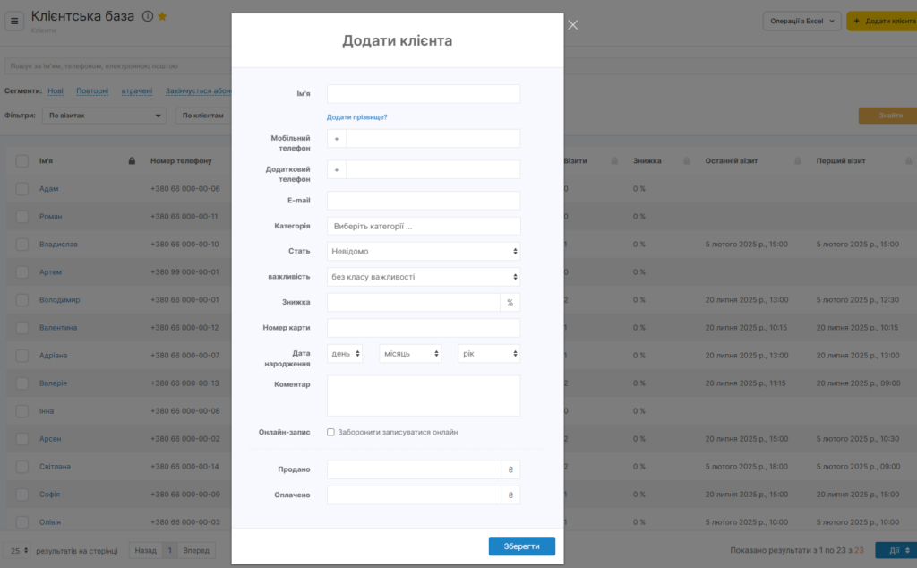 У розділі Клієнти > Клієнтська база ви можете додати нового клієнта вручну або завантажити список клієнтів із таблиці Excel (докладніше про це читайте тут).