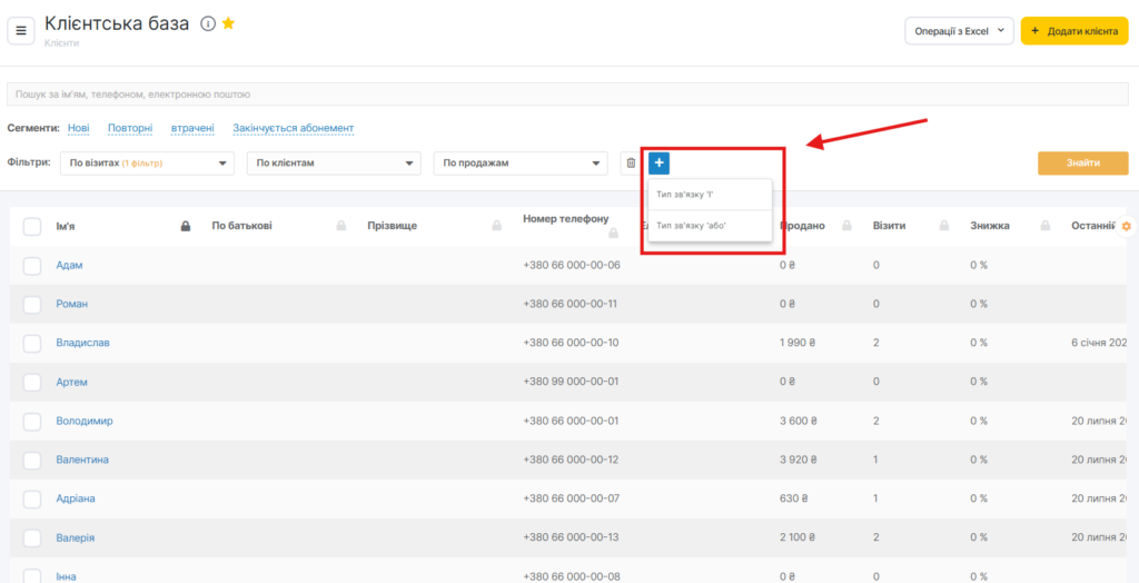 Для сегментації клієнтів у розділі Клієнти > Клієнтська база передбачено низку фільтрів. Ви можете сформувати список клієнтів, для яких можна створити SMS-розсилку (за наявності підключеного SMS-агрегатора) або присвоїти їм певну категорію.