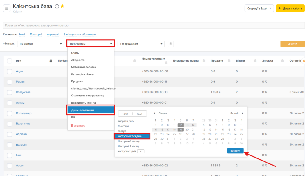 - Виберіть параметр «По клієнтам» — «День народження» — «Наступний тиждень», натисніть «Вибрати»