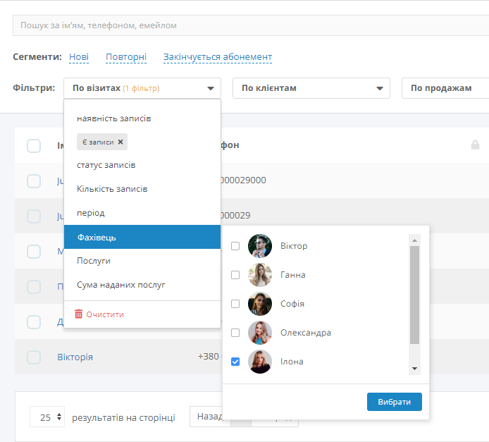 Фільтри поділяються на три типи: «По візитах», «По клієнтами» та «По продажам». Щоб скасувати дію заданих параметрів у межах одного розділу, натисніть кнопку «Очистити» у відповідному типі фільтрів.