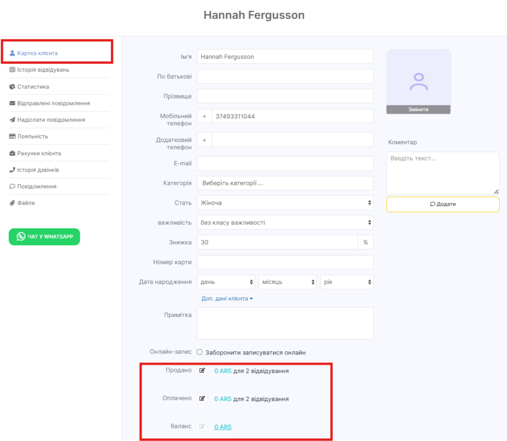 Баланс відображається в картці клієнта. Значення балансу неможливо змінити, оскільки воно формується на підставі даних із полів «Продано» та «Оплачено».