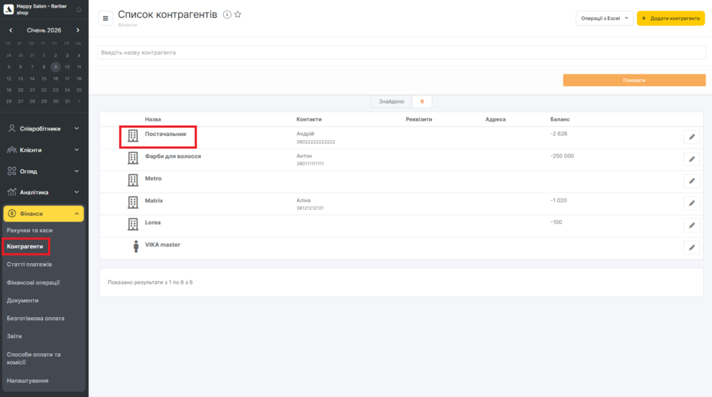 Також ви можете перейти на сторінку фінансових операцій з контрагентом через розділ Фінанси – Контрагенти. Для цього натисніть на назву контрагенти і Altegio перенаправить вас у розділ Фінансові операції, де вже буде встановлений фільтр за вибраним контрагентом.