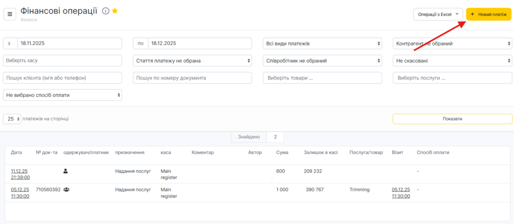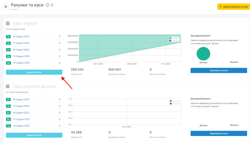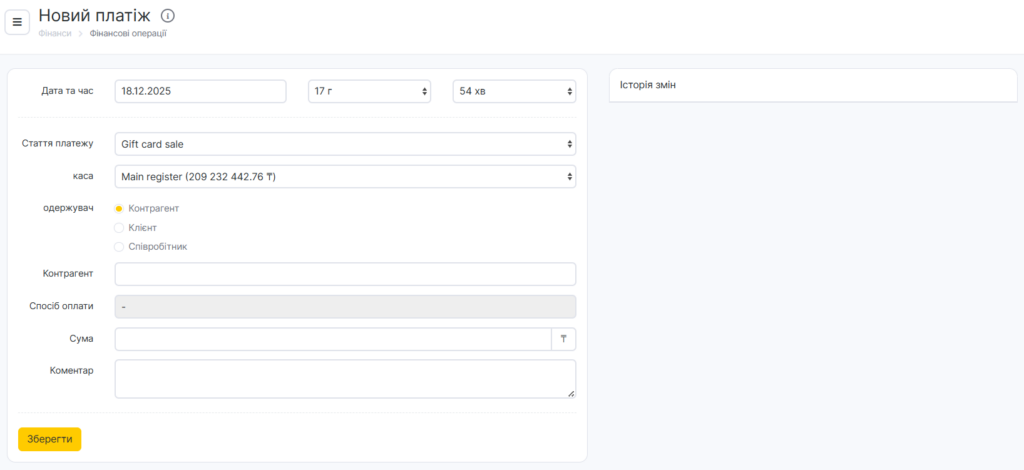 Створити новий платіж ви можете у розділах Фінанси > Фінансові операції та Фінанси > Рахунки та каси.