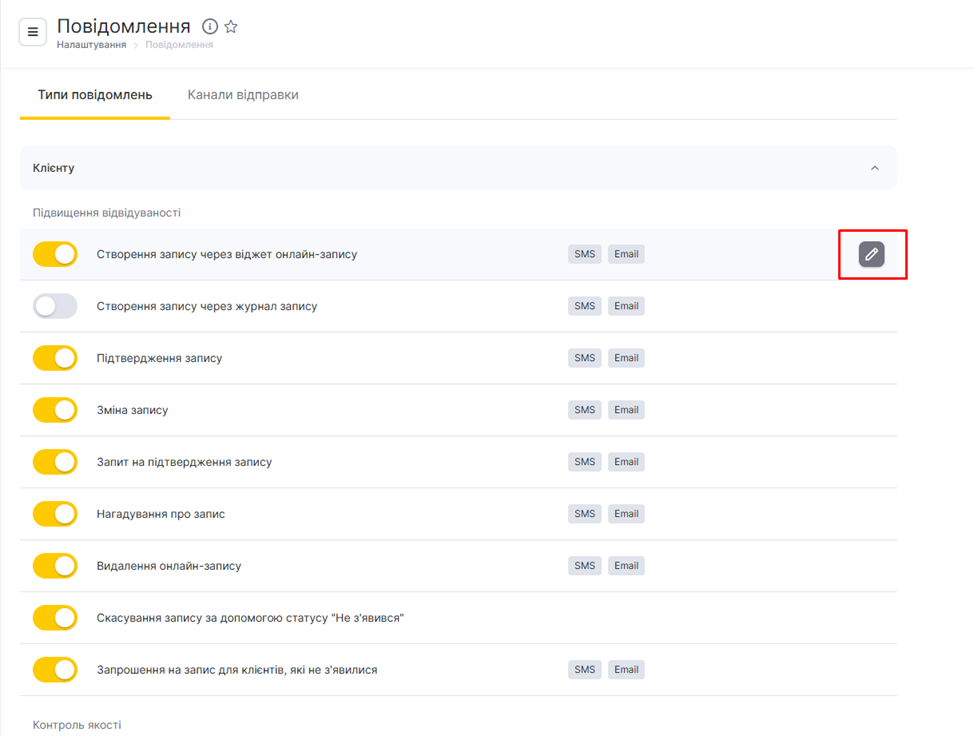 Щоб перейти до редагування типу повідомлень, натисніть кнопку «Змінити» із зображенням олівця поруч із його назвою.