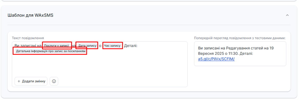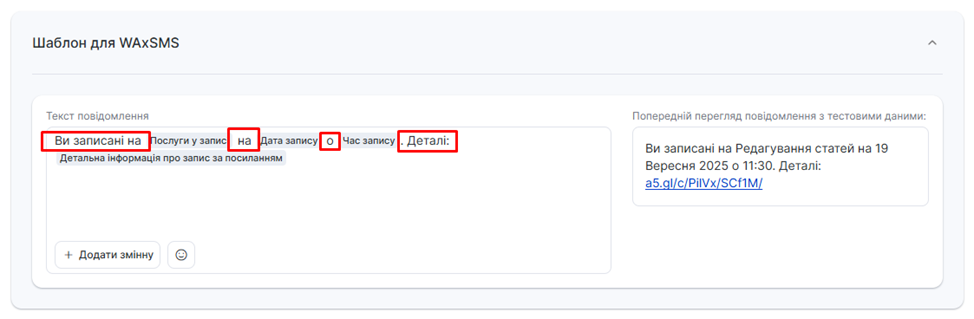 - У шаблони повідомлень не рекомендується додавати emoji смайли, оскільки текст повідомлення у отримувача може відображатися некоректно.